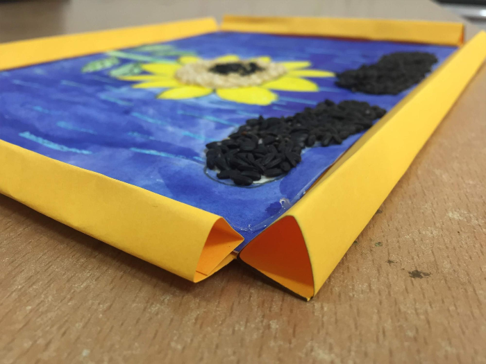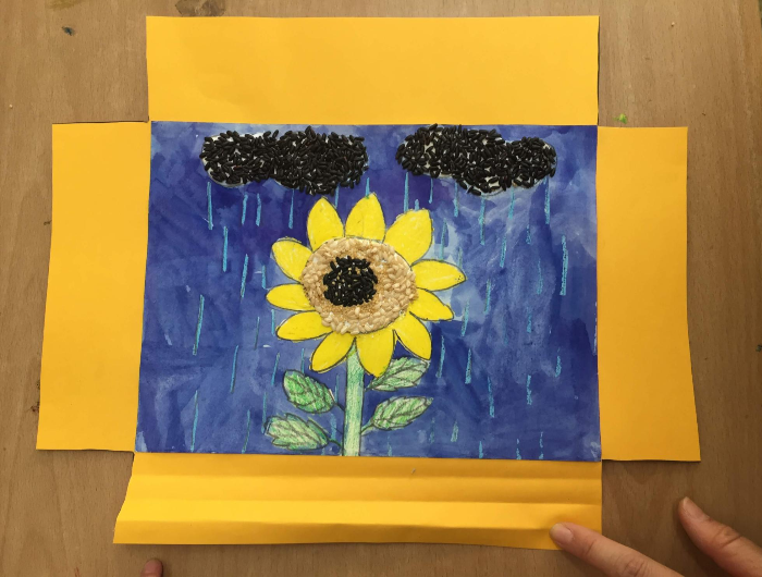 그림을 원하는 색지에 붙이고 네 귀퉁이의 네모진 부분을 잘라냅니다.