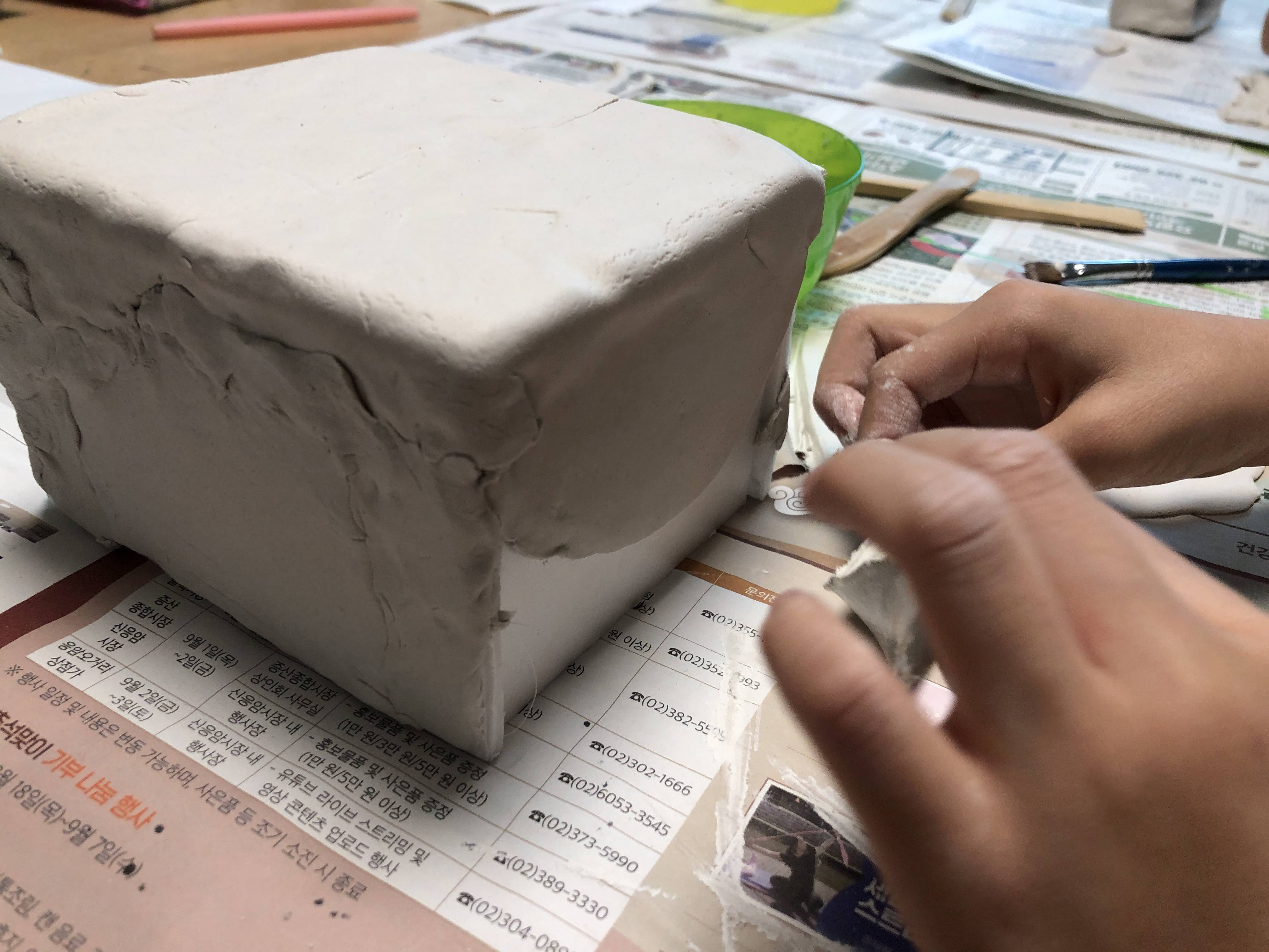 우드락, 글루건, 신문지, 지점토, 밀대, 아크릴물감, 클레이 점토로 작업했어요.